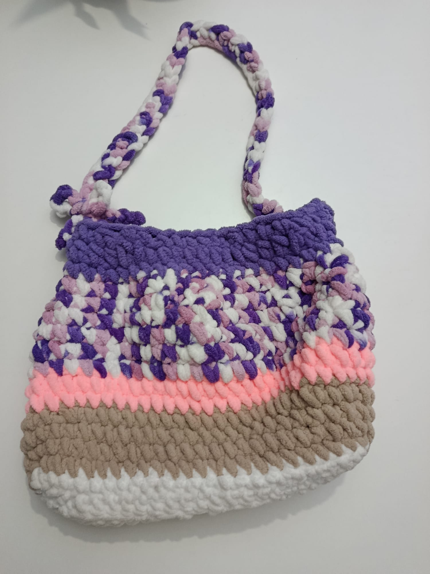 Hecho a mano con lana gruesa tipo chunky, mezcla colores como quien mezcla hilos de vida: morado, blanco, rosa y beige en una combinación que misteriosamente funciona mejor de lo que debería.